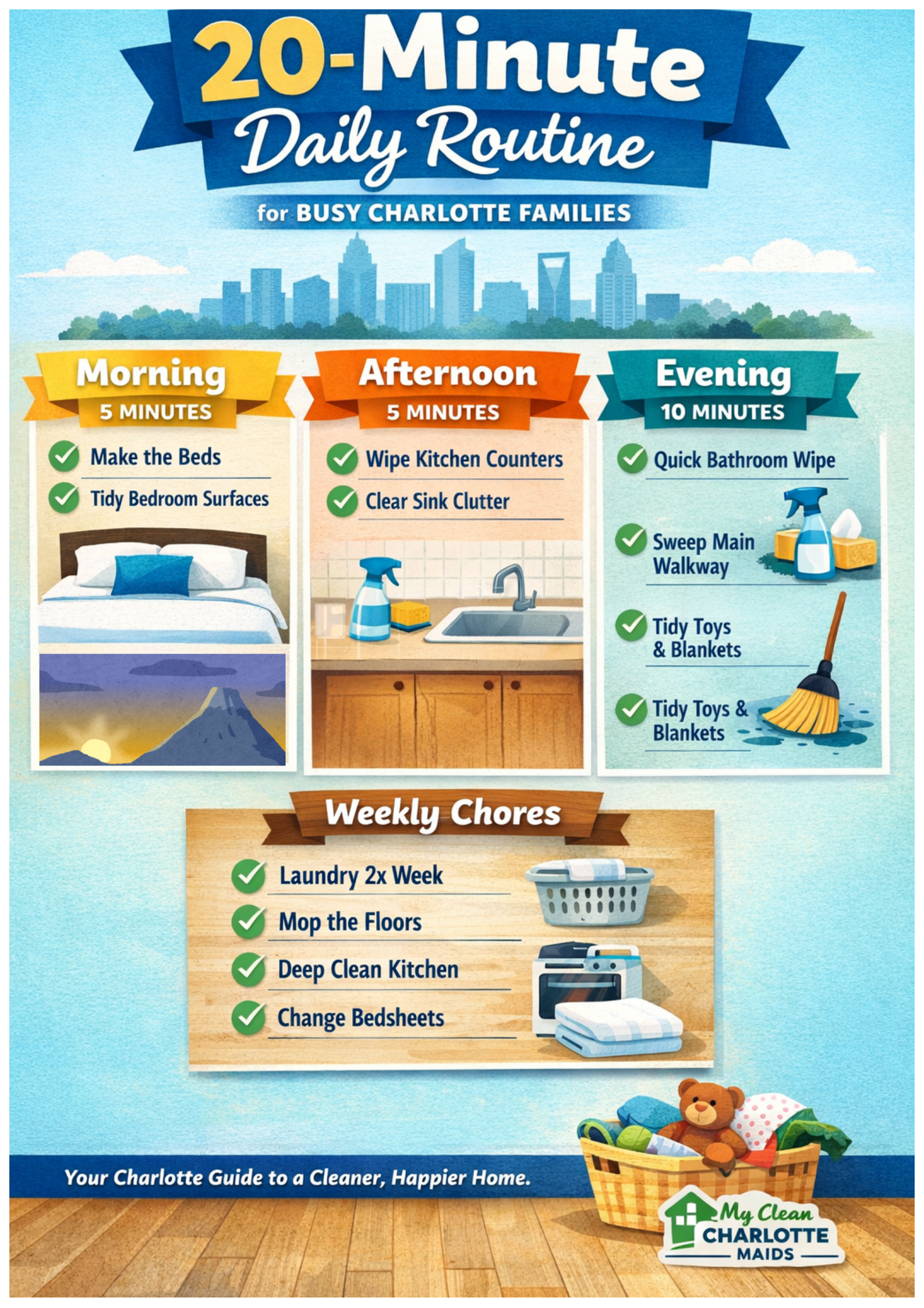 Charlotte families are BUSY — between work, school, and weekend activities, cleaning often gets left behind. Our 20-minute daily routine helps you stay on top of clutter without stress: