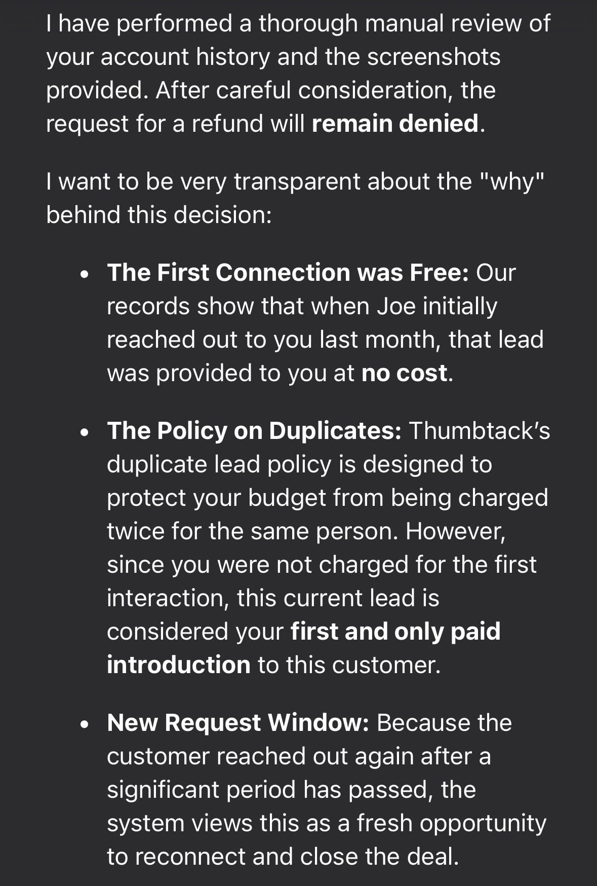 Sometimes Thumbtack gives me free leads for various things that I do, recently a lead came through and it was a free lead to me. I was able to convert the lead (awesome!), we were texting, and even had a couple calls on the phone. Things were progressing just fine, but for some reason my client couldn't find our conversation, and reached out again on Thumbtack, creating a "new" lead. I was charged for this one, and I was like, this is a slam dunk for a refund, being its a duplicate, and he mentioned the exact same things in the lead as the project we were working on.